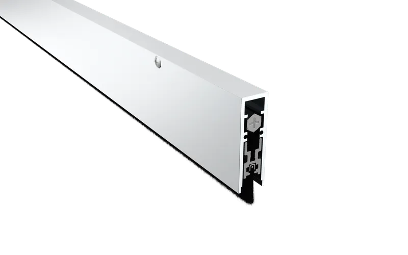 Pemko automatic door bottoms consist of an aluminum case which surrounds a movable drop-bar seal. The drop-bar seal is actuated by a plunger which contacts the jamb as the door is closing, forcing the drop-bar seal down against the floor or threshold. Provides an excellent seal to keep out draft, dust, moisture, insects, fumes, light and sound. Automatic door bottoms seal up to a 3/4″ gap under the door. Surface and semi-mortise application, non-handed. Can be mounted to either wood or hollow metal doors.