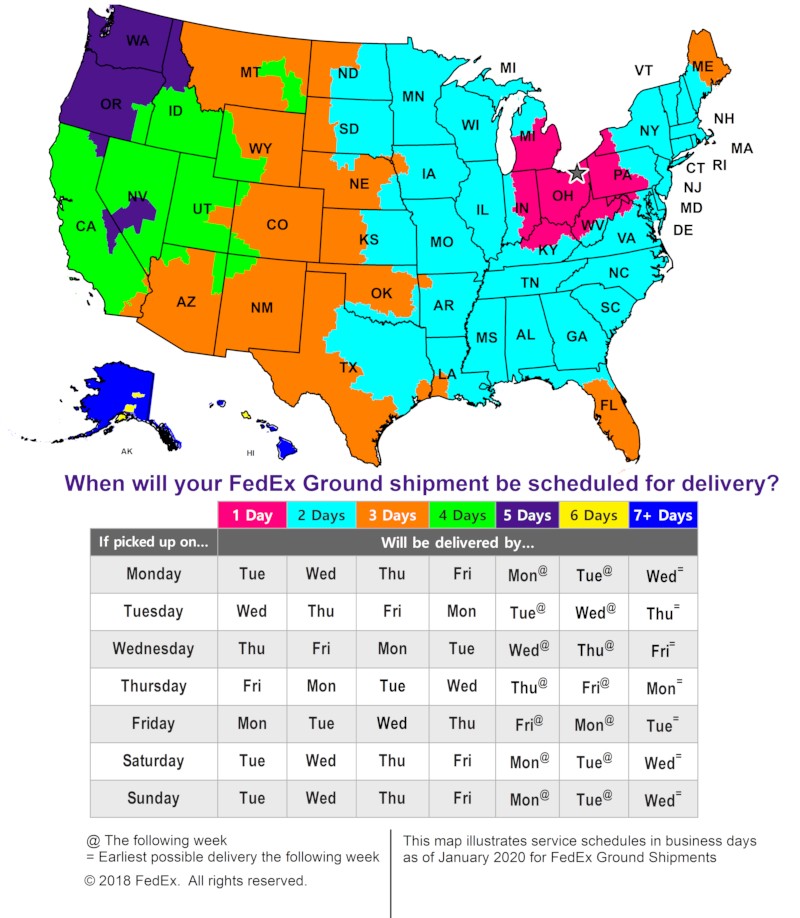 Orders are shipped via Fed-Ex Ground leaving Ohio from zip code 44139. Delivery times vary based on delivery location. Please refer to the Fed-Ex map below for transit times. The tracking information will be emailed to you after 9:00 pm EST on the day your order ships. Please check your email for this information — it’s an automated email from our system with your tracking details.